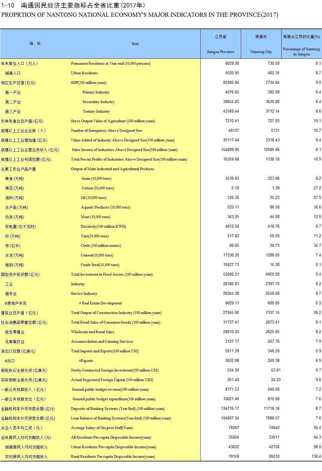 1-10 南通国民经济主要指标占全省比重(2017年)