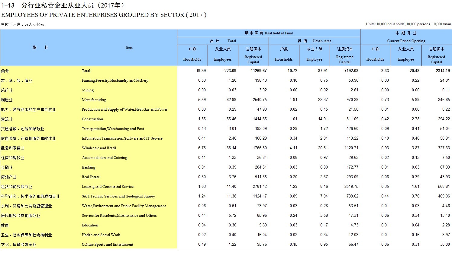 1-13 分行业私营企业从业人员(2017年)