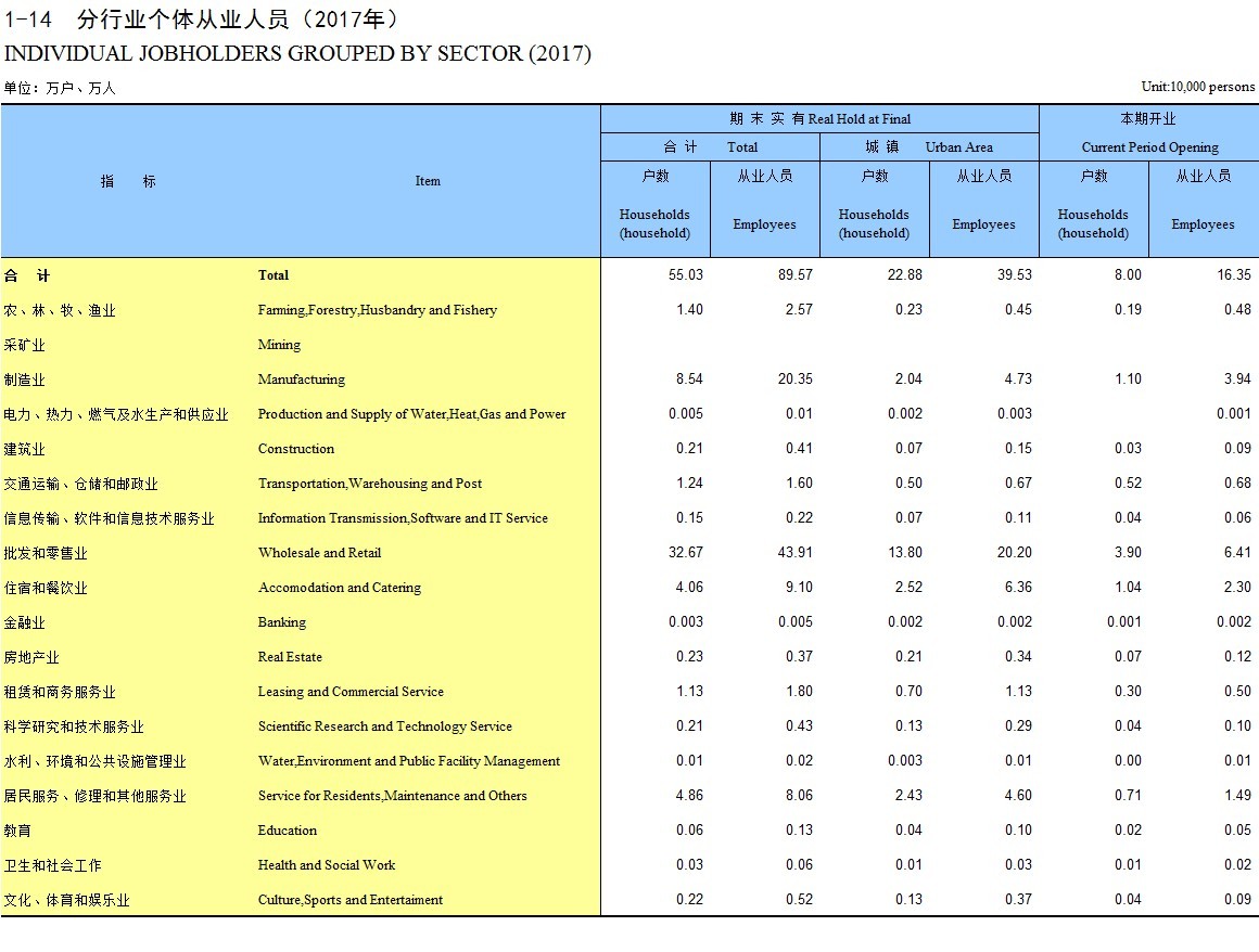 1-14 分行业个体从业人员(2017年)