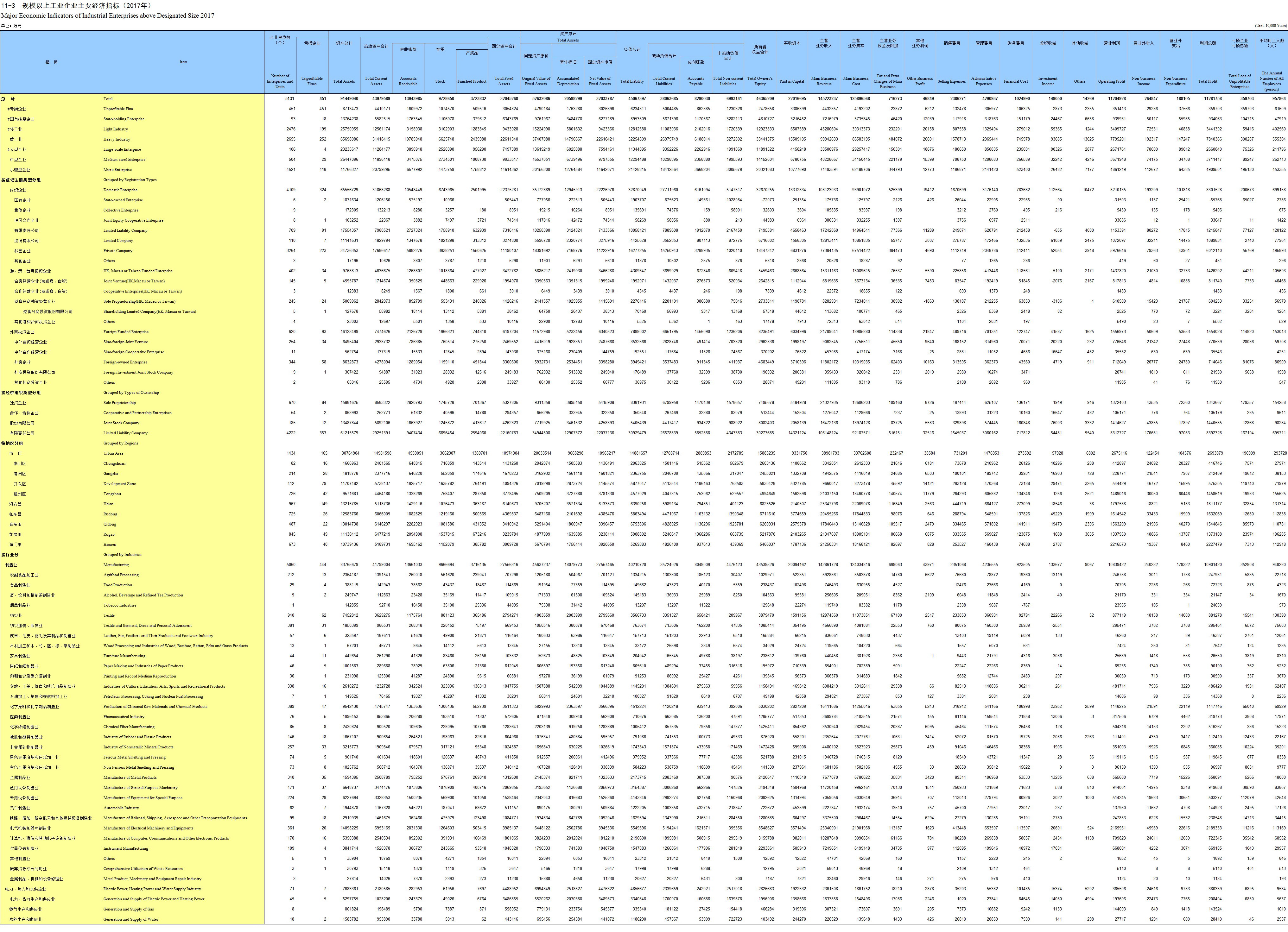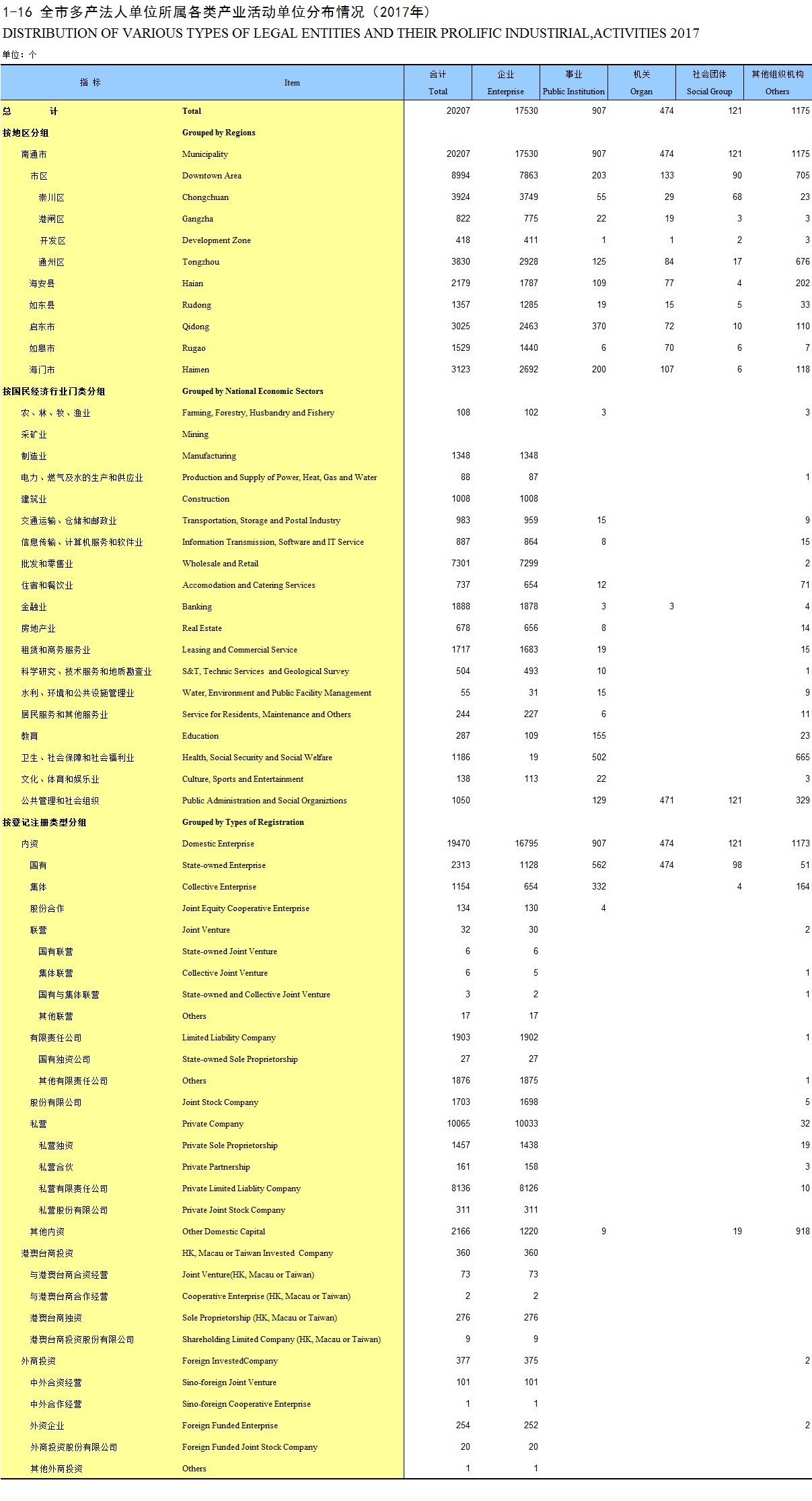 1-17 按地区、行业大类、注册类型分组法人单位及产业活动单位数(2017年)