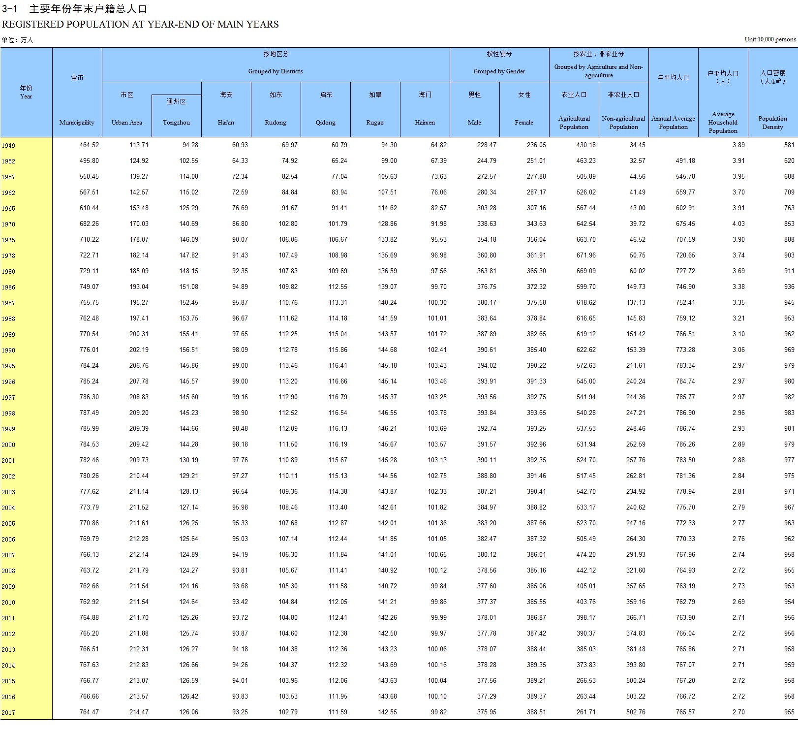 3-1 主要年份年末户籍总人口
