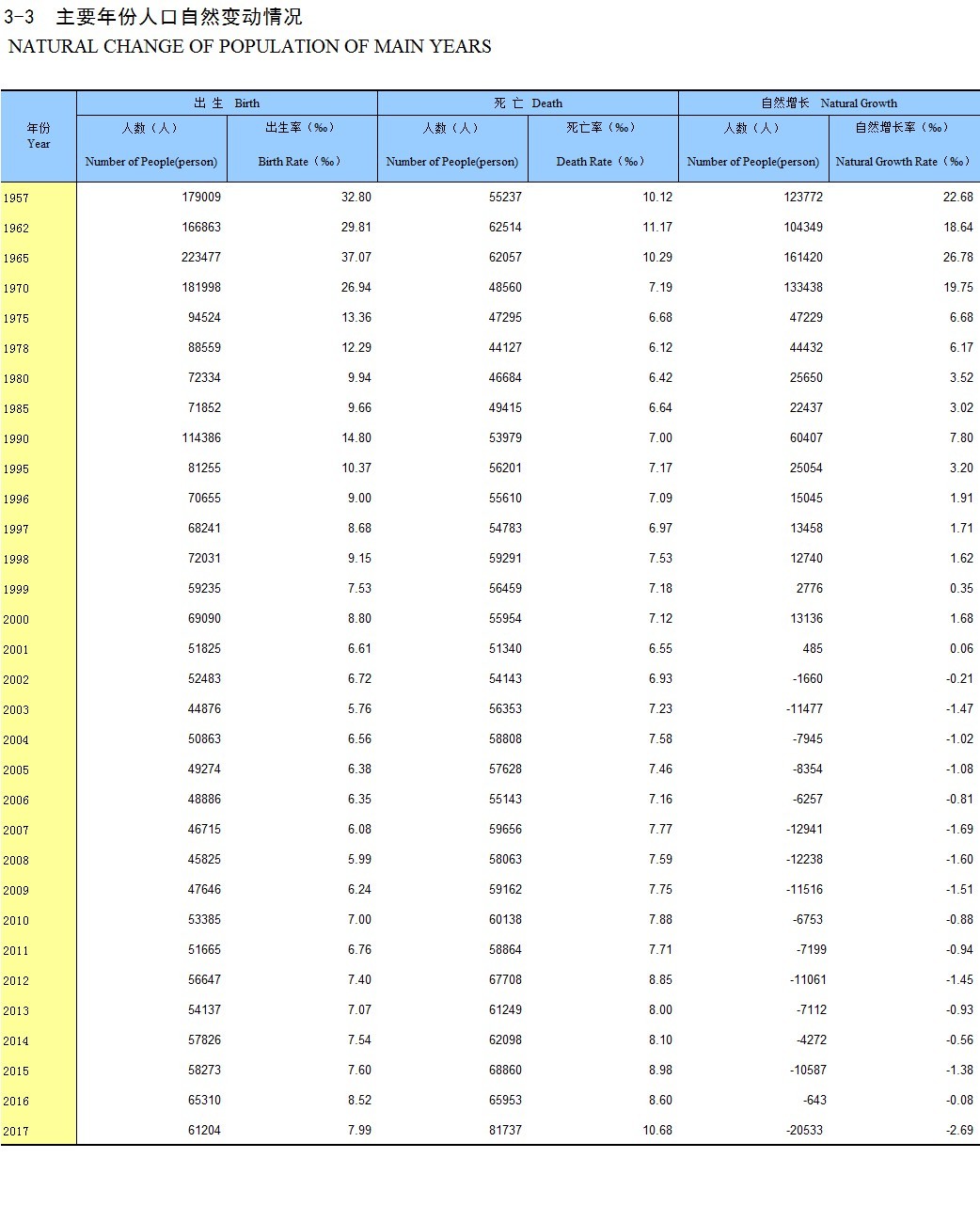 3-3 主要年份人口自然变动情况