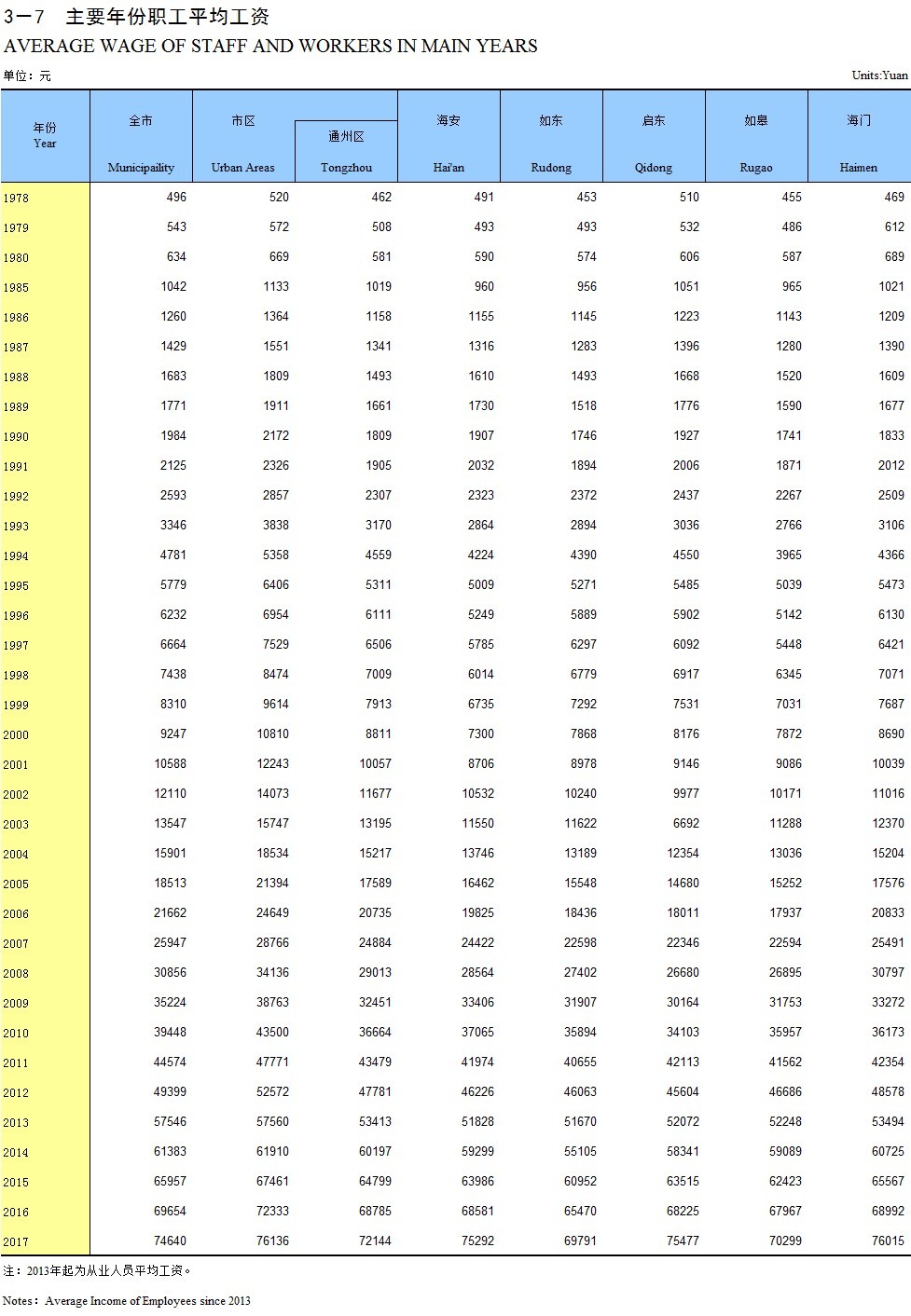 3-7 主要年份职工平均工资