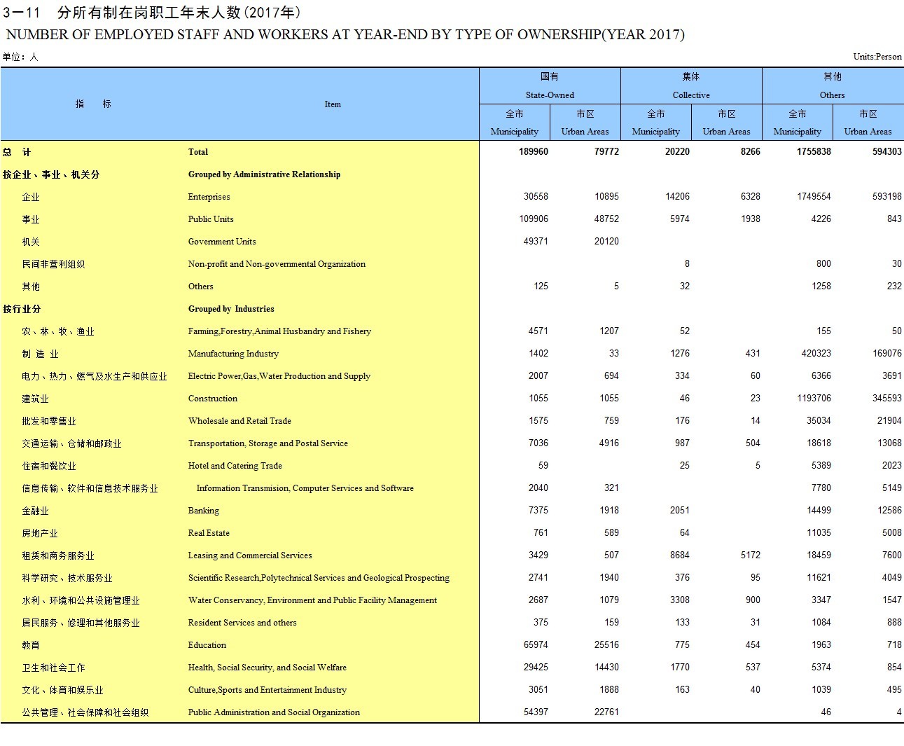 3-11 分所有制在岗职工年末人数(2017年)