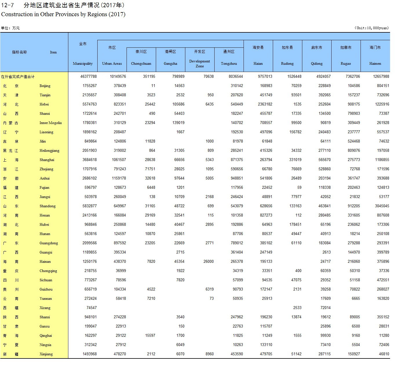 12-7 分地区建筑业出省生产情况(2017年)