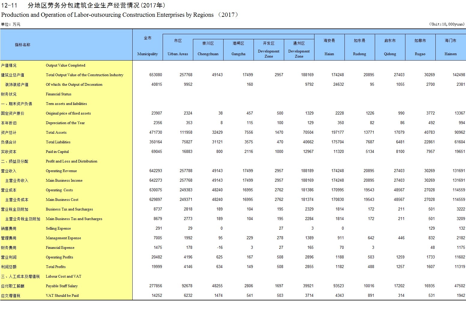 12-11 分地区劳务分包建筑企业生产经营情况(2017年)
