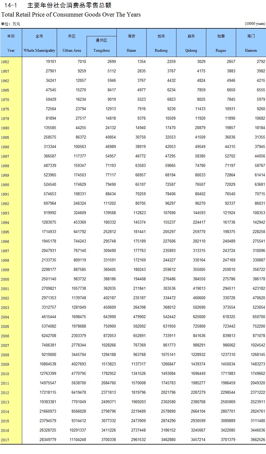 14-1 主要年份社会消费品零售总额