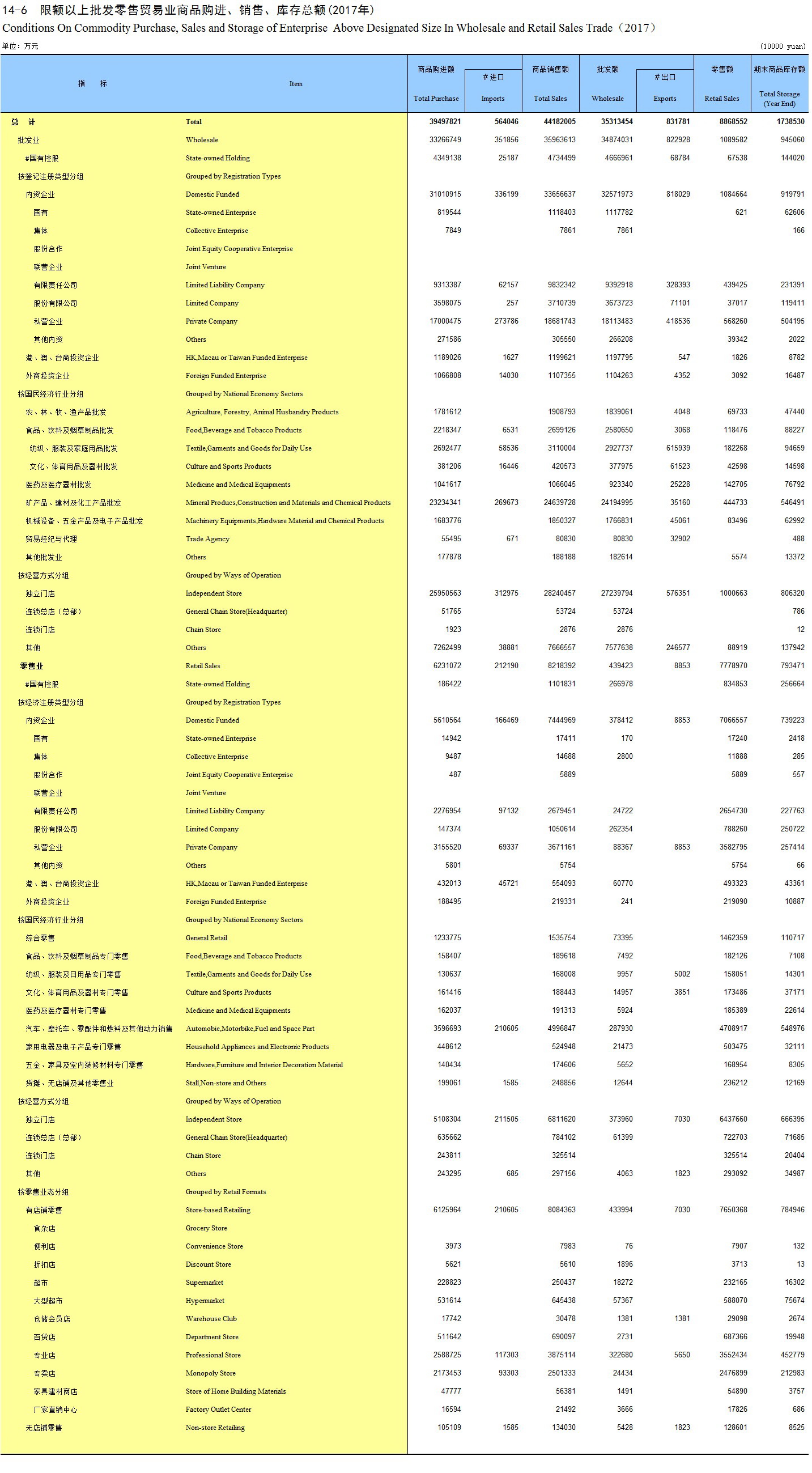 14-6 限额以上批发零售贸易业商品购进、销售、库存总额(2017年)