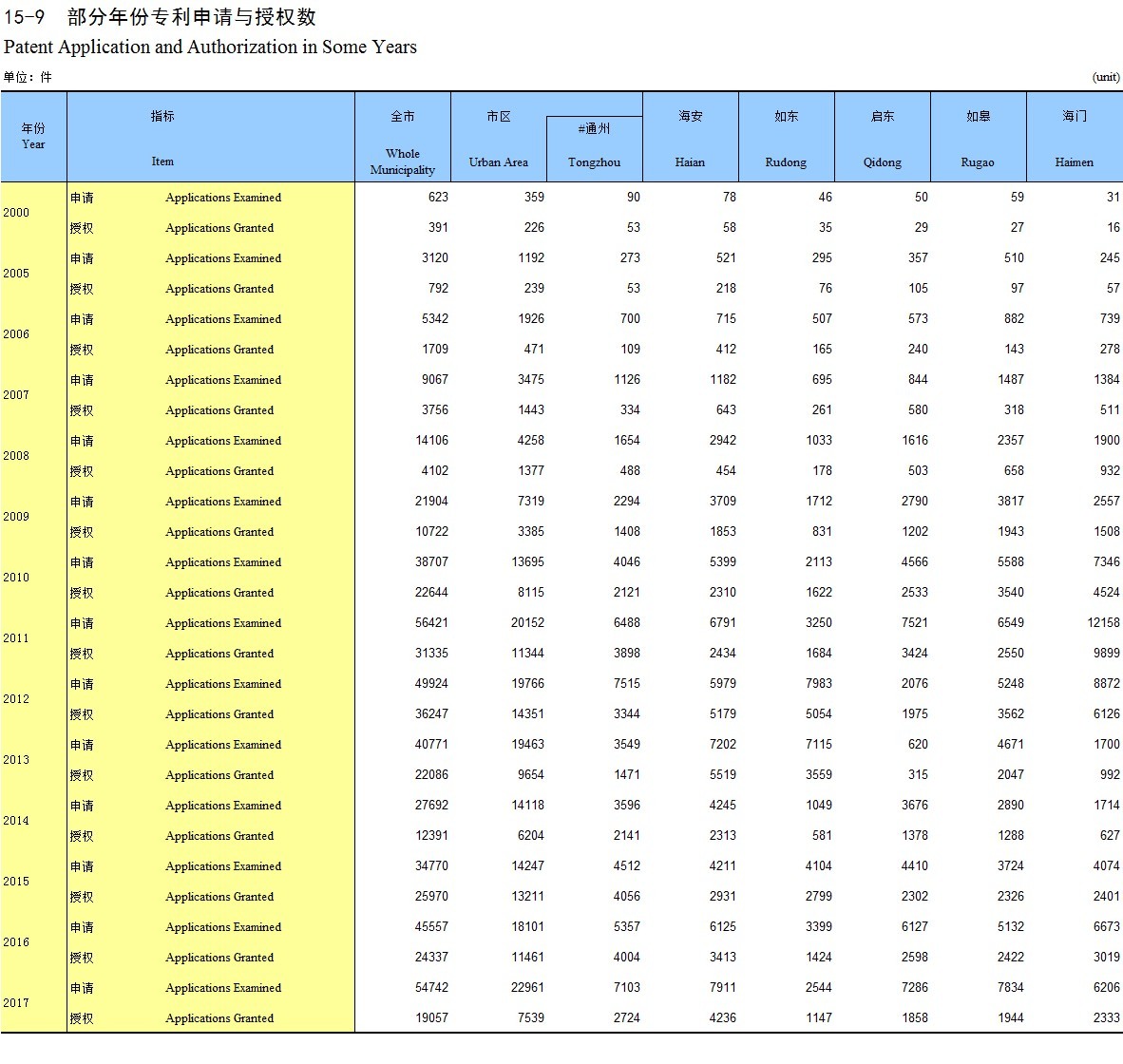 15-9 部分年份专利申请与授权数