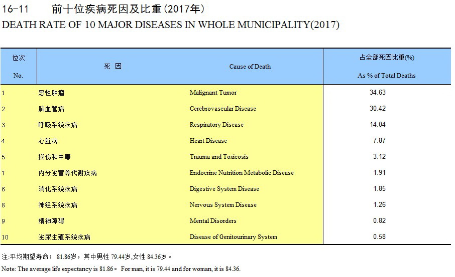 16-11 前十位疾病死因及比重(2017年)