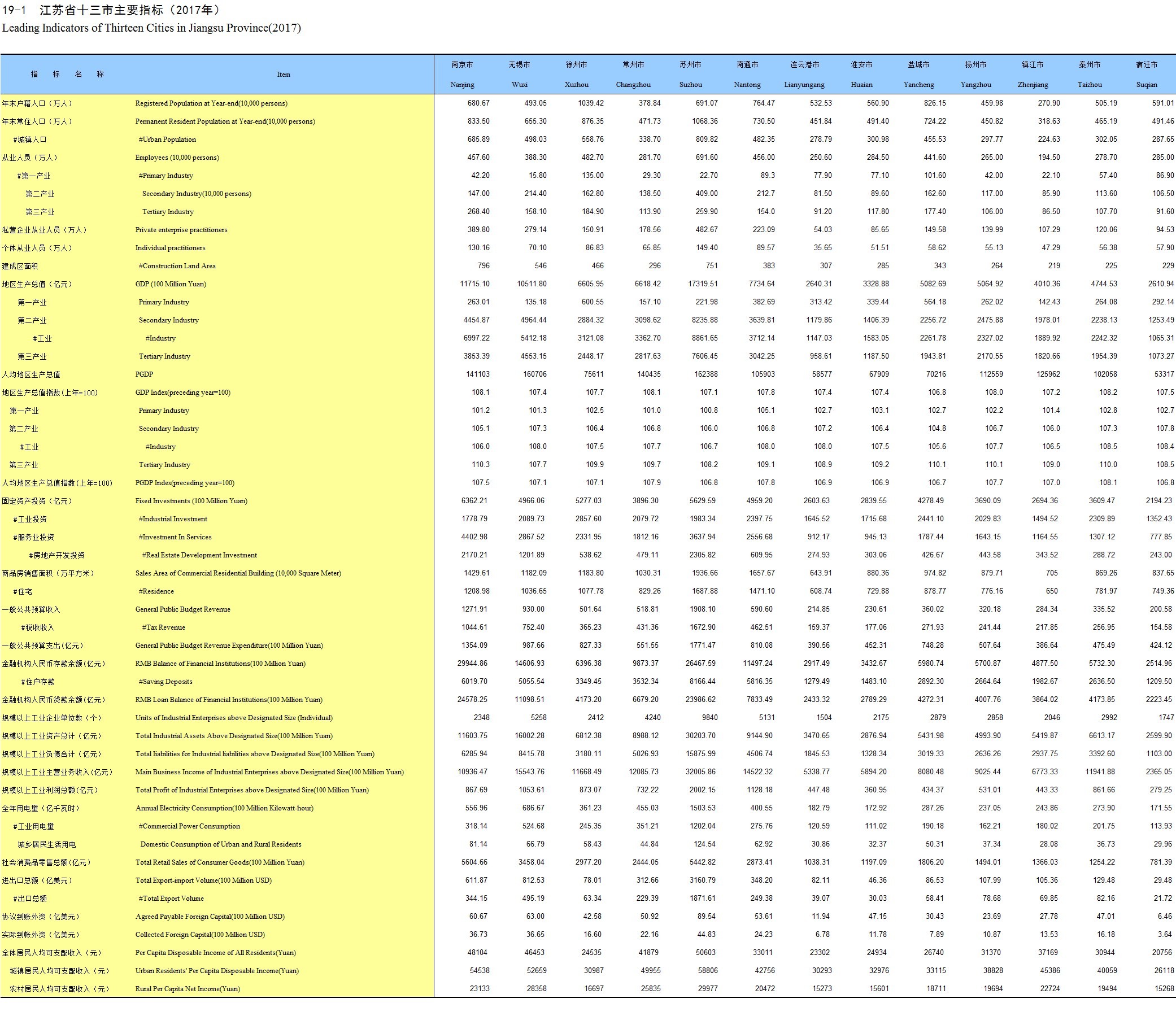19-1 江苏省十三市主要指标(2017年)