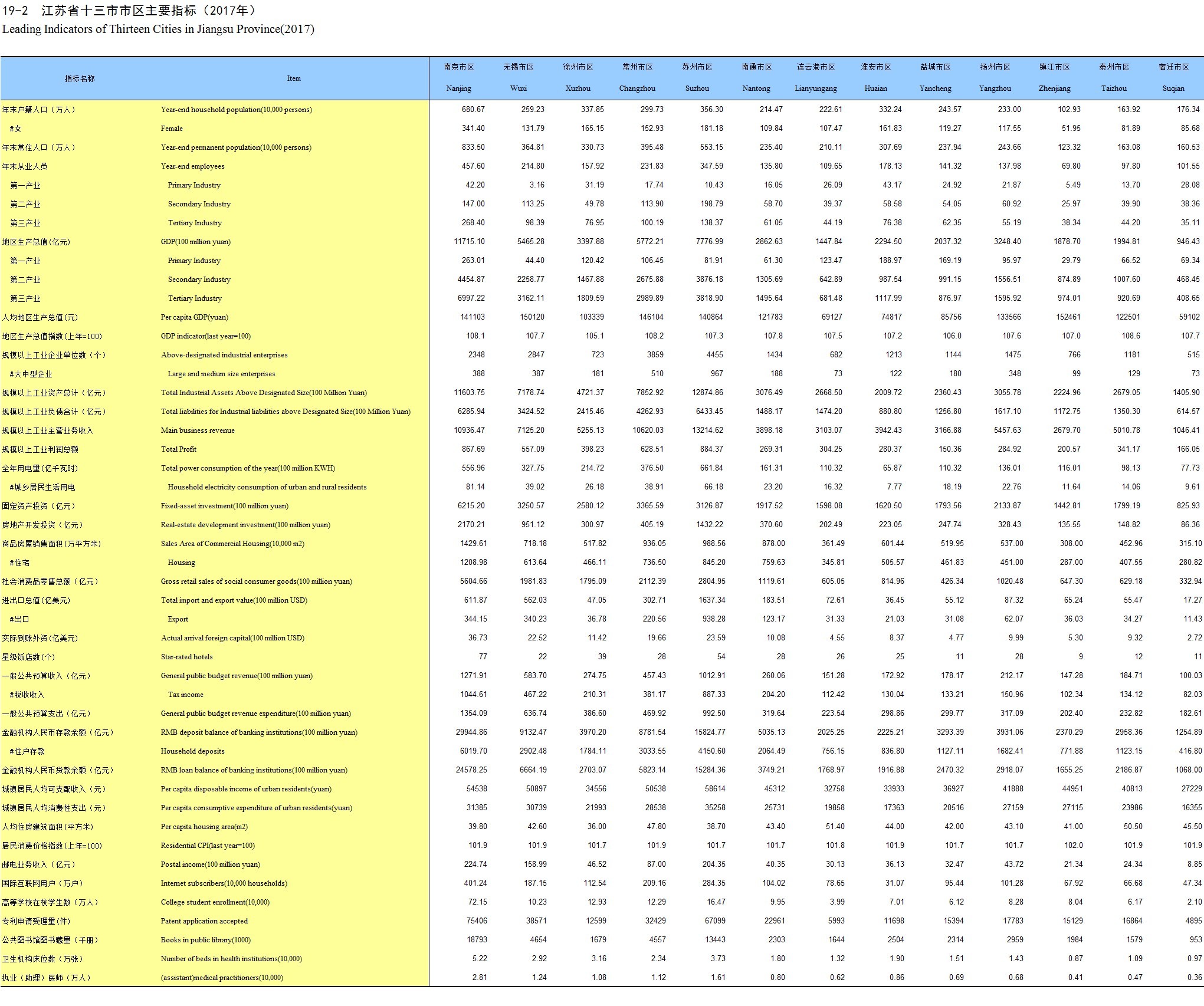 19-2 江苏省十三市市区主要指标(2017年)